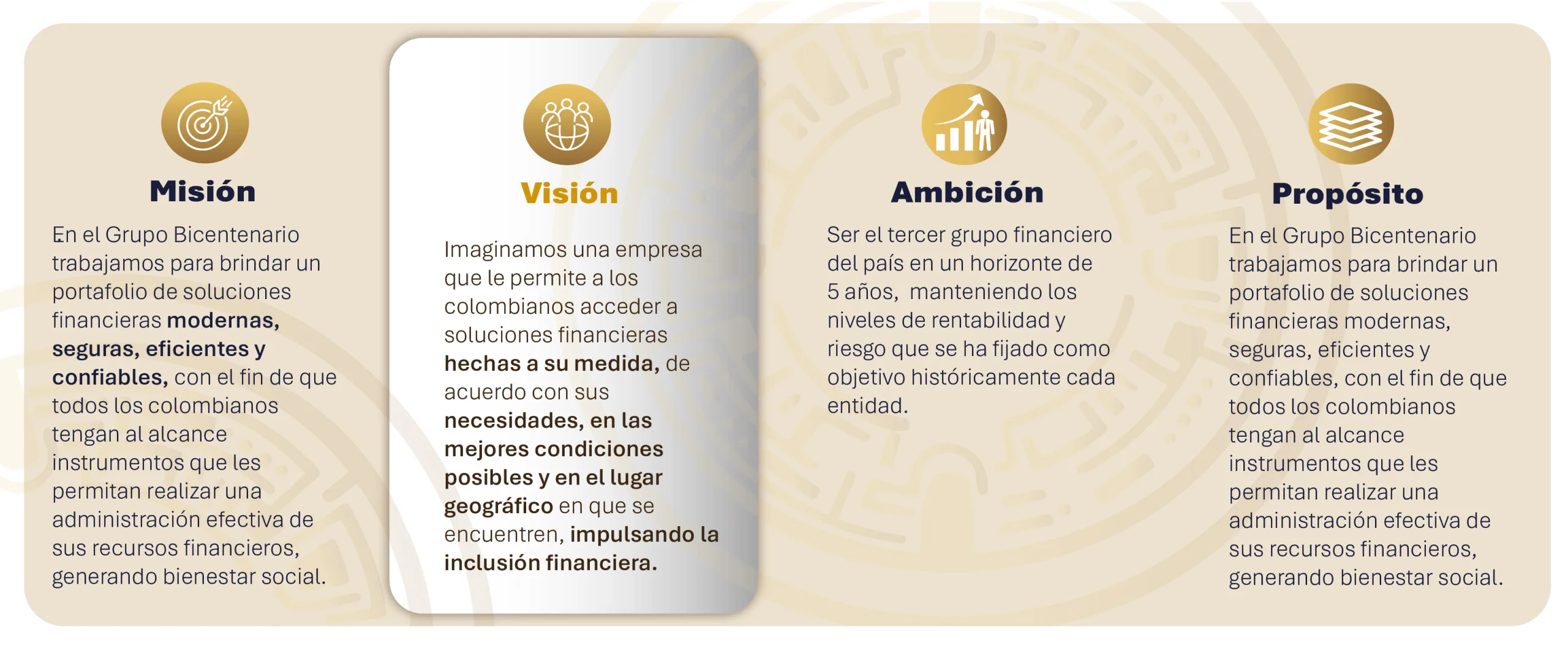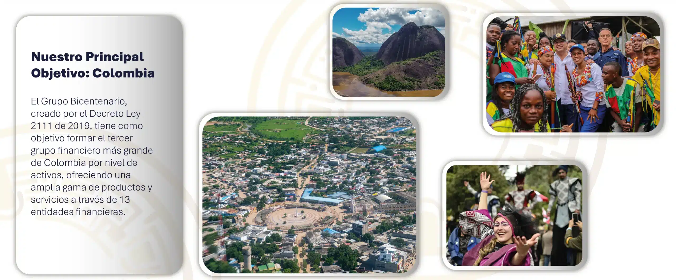 En GRUPO BICENTENARIO S.A.S., creemos en el poder transformador de las finanzas para mejorar vidas y contribuir al desarrollo integral de Colombia. Unidos, trabajamos para crear oportunidades y forjar un camino hacia un bienestar compartido.